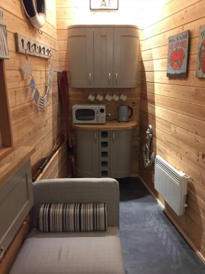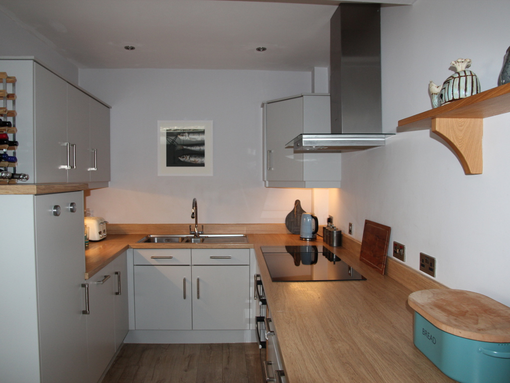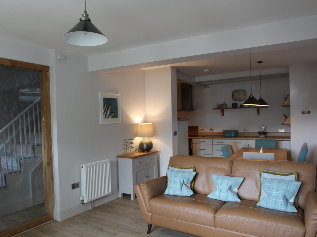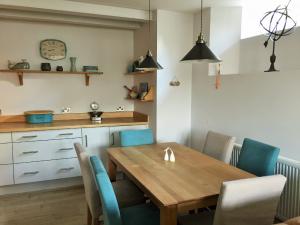 The kitchen on the ground floor is fully equipped with utensils, induction hob, toaster, microwave, dishwasher, fridge and freezer. Tassimo cofee machine. It is open plan with the dining and living room, which has a wood burner and smart TV with DVD player. Both the dining and garden table have space for up to 6.